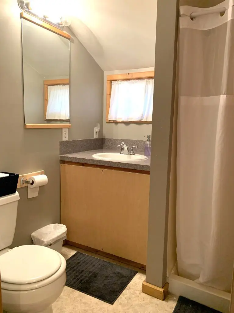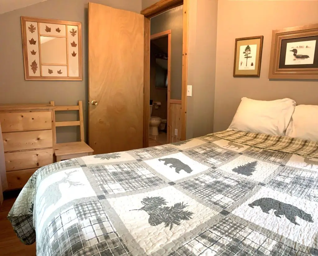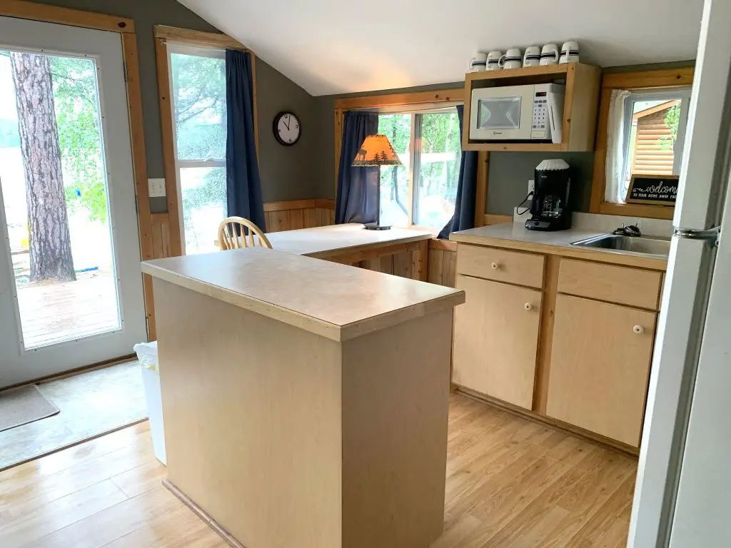 Features of Cabin 1 include a light, inviting interior with a vaulted ceiling. Wood laminate flooring. French patio doors that open to a large deck. Large windows provide a beautiful lake view. Of the three bedrooms, 1 bedroom has a queen bed, one has a double bed, and the third has 1 set of built-in twin bunk beds. The bathroom has a shower. Kitchen cabinets and a center island provide ample storage and counter top work surface. Cabin 1 is the end lakeside cabin, set away from the main swimming beach and lodge. Maximum occupancy 6.